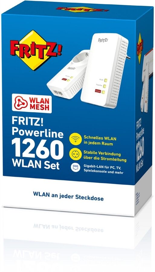Das FRITZ!Powerline 1260 WLAN Set verbindet netzwerkfähige Geräte wie Computer, Fernseher oder Spielekonsolen zuverlässig auch über große Entfernungen im Heimnetz über ultraschnelles Gigabit-LAN. Mit der Vernetzung über die Stromleitung werden lange Distanzen sowie Hindernisse, wie Wände und Decken, spielend gemeistert. Gegenüber Powerline-Adaptern der 500- und 200-MBit/s-Klasse ermöglicht FRITZ!Powerline 1260 deutlich mehr Übertragungskapazität und robustere Verbindungen – bei hoher Energieeffizienz. Mehrere anspruchsvolle Breitband-Anwendungen werden so zeitgleich nutzbar.