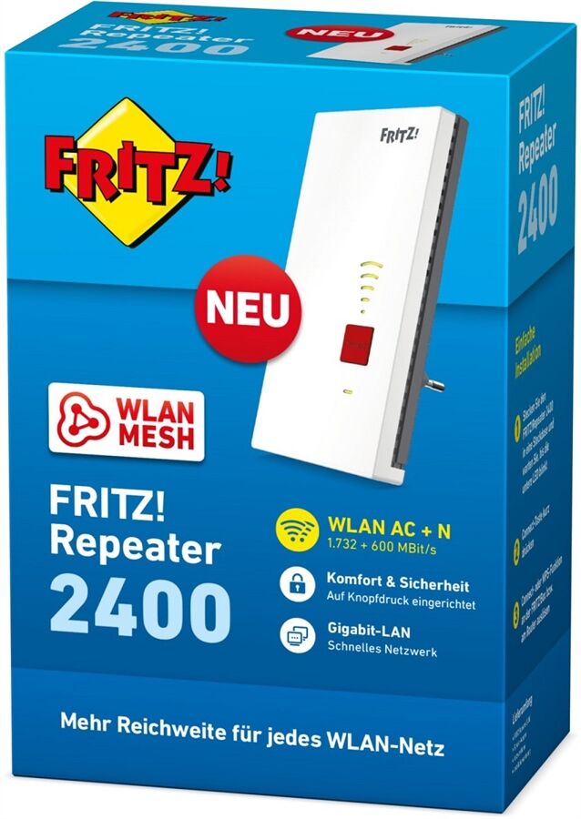 Der FRITZ!Repeater 2400 erhöht schnell und einfach die Reichweite jedes WLANs. Mit zwei Funkbändern in den Standards WLAN AC und WLAN N, die in Summe einen Datendurchsatz von bis zu 2.333 MBit/s erzielen können, stellt der Repeater eine stabile Verbindung und ein Maximum an Bandbreite für alle verbundenen WLAN-Geräte zur Verfügung. Gleichzeitig sorgt der Repeater für eine perfekte Funkabdeckung bis in den letzten Winkel von Haus und Wohnung.