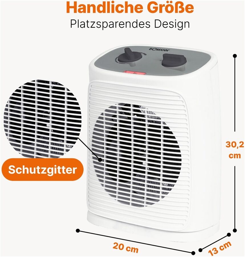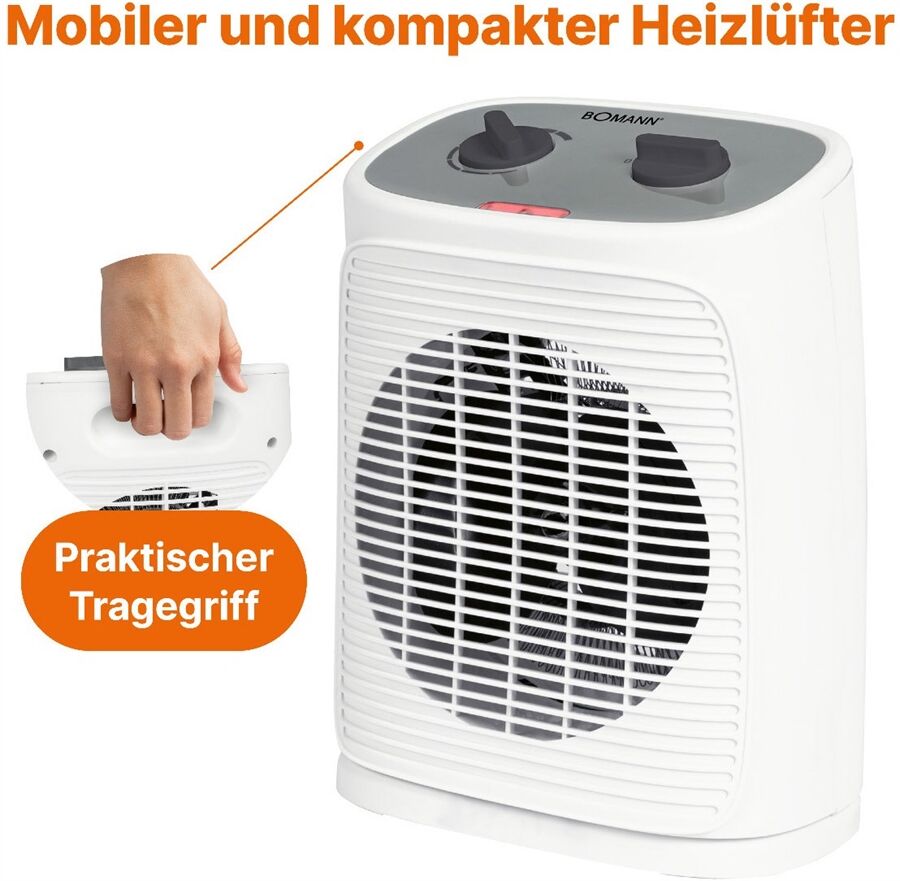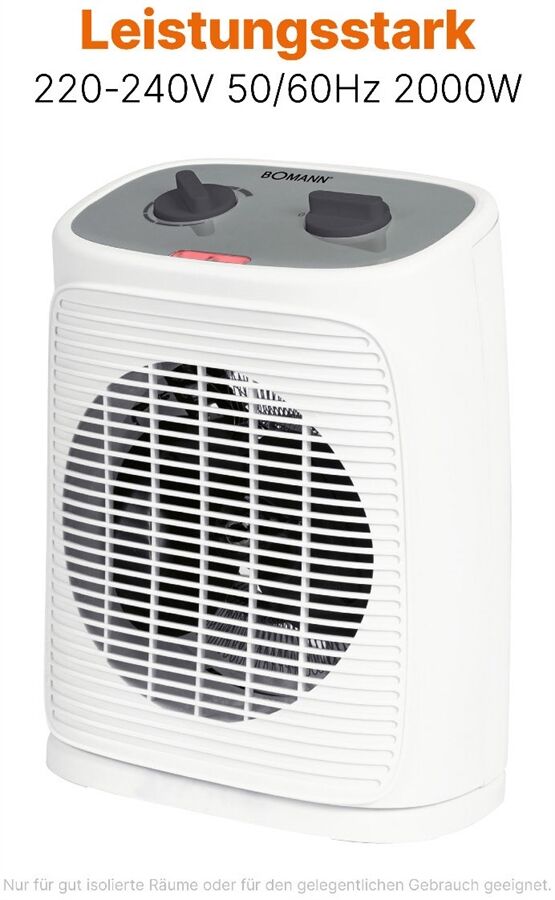 Erleben Sie Wärme, wo immer Sie sie brauchen, mit unserem mobilen, kompakten Heizlüfter von Bomann®. Ausgestattet mit einem stabilen Tragegriff, lässt er sich problemlos transportieren. Zwei Heizstufen (1000/2000 Watt) und ein stufenlos regelbarer Thermostat sorgen für eine individuell anpassbare Wärmeleistung. In den wärmeren Monaten können Sie die Kaltstufe nutzen, die als Ventilator fungiert. Mit der zuschaltbaren Schwenkfunktion wird die Wärme gleichmäßig im Raum verteilt. Der Heizlüfter stellt höchste Sicherheit in den Vordergrund: Der Überhitzungsschutz und ein Sicherheitskontaktschalter minimieren das Risiko von Bränden. Eine Kontrollleuchte zeigt den Betriebszustand des Geräts an. Mit einer Spannung von 220–240 V, einer Frequenz von 50/60 Hz und einer maximalen Leistung von 2000 W bietet unser Heizlüfter zuverlässige Leistung. Der sichere Stand verhindert ein Umkippen. Mit diesem Heizlüfter genießen Sie Wärme und Komfort zu jeder Jahreszeit.