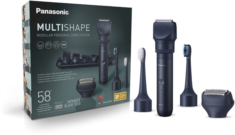 Mit dem neuartigen MULTISHAPE Konzept räumt Panasonic in überquellenden Badezimmerschränken auf und bringt mehr Nachhaltigkeit in die Männerpflege. Erstmalig können sich Anwender ihr persönliches Pflegetool von Grund auf modular zusammenstellen. Das attraktive XSHAPE TRAVEL Set verfügt über das Handstück mit Lithium-Ionen-Akku und vier Aufsätzen (ER-CKL2) für das Trimmen von Bart-, Kopf- und Körperhaaren. Zusätzlich enthält das XSHAPE TRAVEL Set den 3-KlingenRasiereraufsatz ER-CSF1 sowie den elektrischen Schallzahnbürstenaufsatz ER-CTB1. Dem Anwender stehen hierbei noch eine Vielzahl anderer kompatibler Aufsätze zur Auswahl wie z.B. einem Präzisionsrasierer und Detailtrimmerset oder einem Pediküreaufsatz (nicht im Lieferumfang enthalten). Der MULTISHAPE überzeugt mit japanischer Klingentechnologie und ist mit hochwertigen 45-GradEdelstahlklingen ausgestattet. Die Längeneinstellung erfolgt komfortabel in 58 Schritten über ein Drehrad, von 1 bis 30 mm in 0,5-mm-Intervallen. Der Lithium-Ionen-Akku ermöglicht bis zu 70 Minuten Betrieb bei nur einer Stunde Ladezeit.