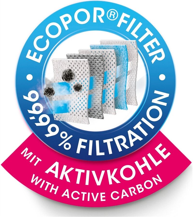 - Der EcoPor® Filter filtert 99,99% des eingesaugten Hausstaubs und allergenen Feinstaubs, wie z.B. Pollen, Schimmelsporen, Milbenkot und Bakterien.