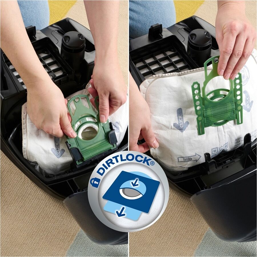 Der Volumenstaubspeicher und die abgerundeten Ecken stellen eine optimale Ausnutzung des Staubraums sicher und ermöglichen somit eine längere Verwendungsdauer des Beutels. Sollte der Beutel doch einmal voll sein, ist die Entsorgung dank des praktischem Dirtlock® Staubverschlusses bequem und sauber.
